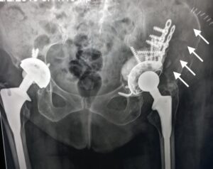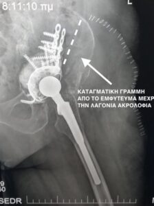 - Σοβαρό περιπροθετικό κάταγμα κοτύλης, όπου δημιουργήθηκε stress riser (αυξημένη συγκέντρωση φορτίων ) στο πέρας του ενισχυτικού δακτυλίου και έγινε καταγματική γραμμή από το εμφύτευμα σε όλη τη διαδρομή του λαγονίου οστού!!!