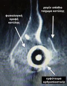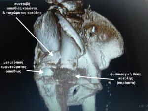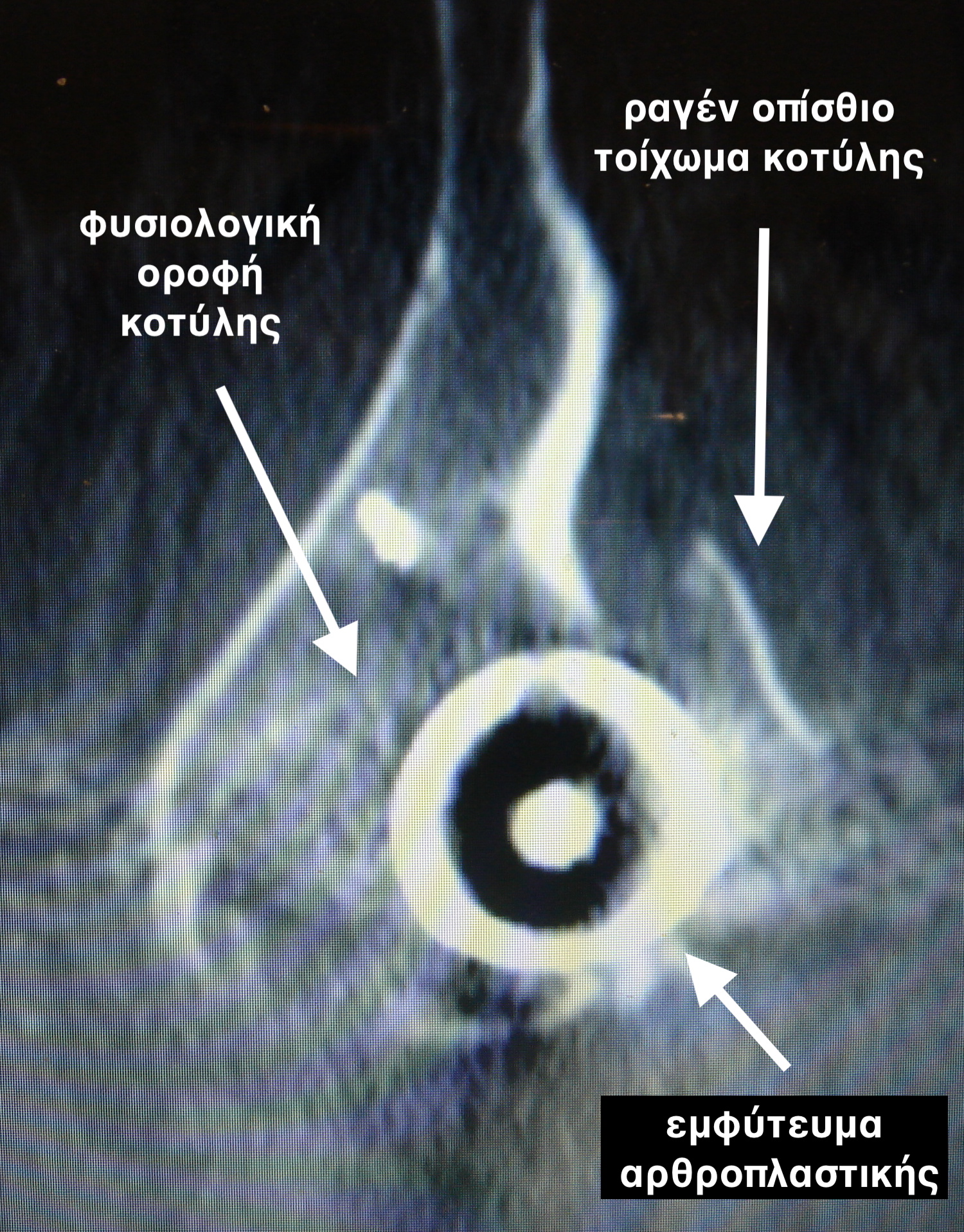 - Τρισδιάστατη αξονική τομογραφία (παράσιτα λόγω εμφυτεύματος) δείχνει την αποκόλληση του εμφυτεύματος της κοτύλης και την οπίσθια μετατόπιση του , μαζί με το κάταγμα του οπισθίου τοιχώματος της κοτύλης.
