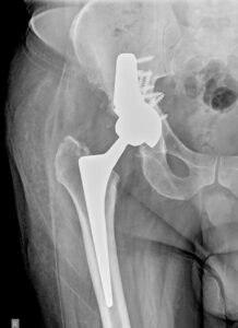 - Ακτινογραφία που εκ πρώτης όψεως δείχνει να μην έχει σοβαρό πρόβλημα, όμως έχει τεράστιο περιπροθετικό κάταγμα της κοτύλης. Έχει αποκολληθεί το εμφύτευμα από τη θέση του και έχει αποσπασθεί μαζί με ολόκληρο το οστικό οπίσθιο τοίχωμα της κοτύλης