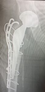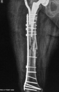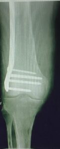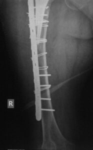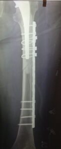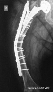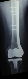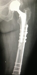 - Η τελική οστεοσύνθεση που πραγματοποιήθηκε στο κέντρο μας με ειδική πλάκα τιτανίου από τους μηριαίους κονδύλους μέχρι τον ελάσσονα τροχαντήρα, αλληλοεπικάλυψη των υλικών χωρίς τη δημιουργία υψηλών συγκεντρώσεων φορτίων (stress risers). Επίσης έγινε βιολογική ενίσχυση του κατάγματος.