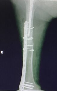 - Ευθυγράμμιση του οστού και η οστεοσύνθεση με ειδική πλάκα τιτανίου και κλειδούμενους κοχλίες.